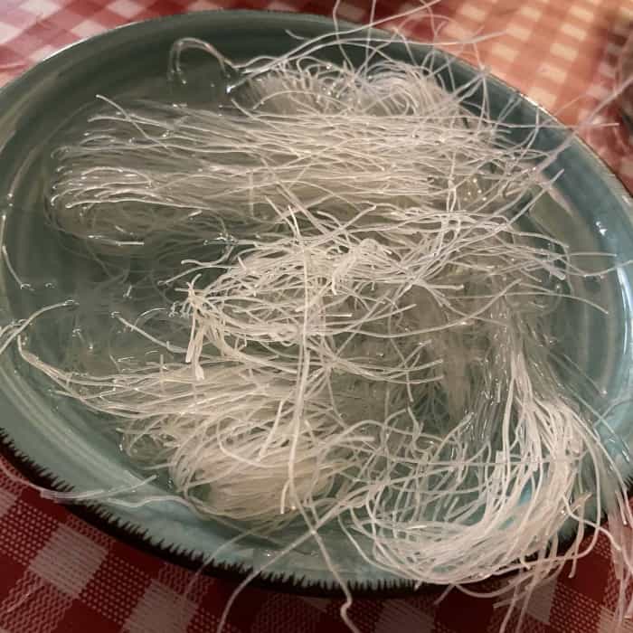 Für 3-4 Portionen nimmt man 100 g Glasnudeln, die in eine Schüssel in kaltem Wasser schon mal eingeweicht werden. Auf der Packung steht meistens was von 10 Minuten, aber länger ist auch nicht schlimm. Einfach einweichen und in der Zwischenzeit den Rest fertig machen.