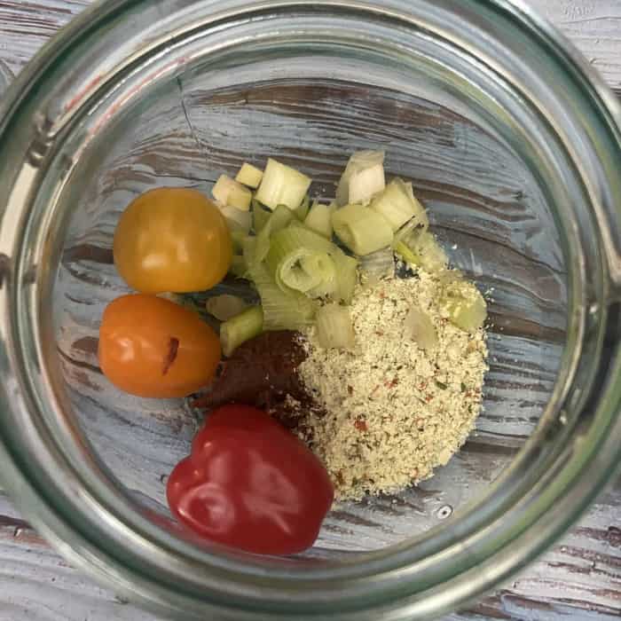 - Auf den Boden eines verschließbaren Behälters gekörnte Gemüsebrühe und zum Beispiel Miso-Paste geben.
