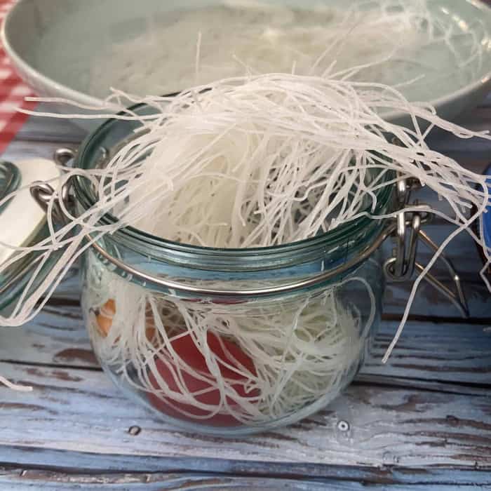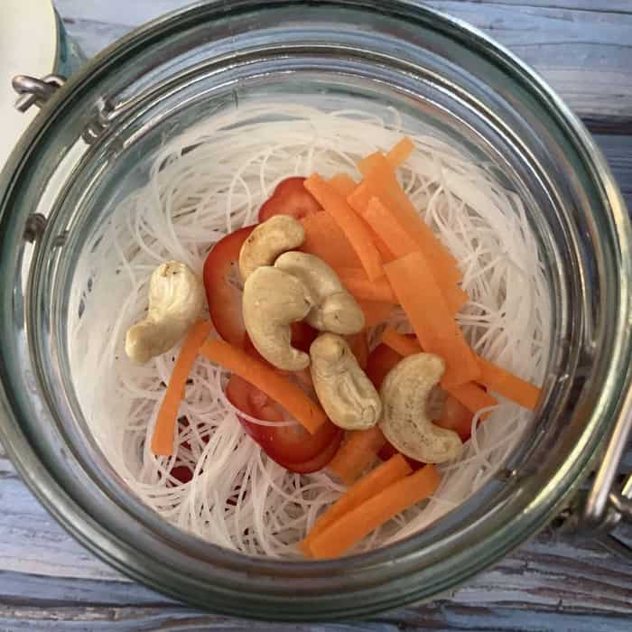 Die Glasnudeln habe ich den Fingern schön nach unten geschoben, bis sie dicht auf dem Gemüse saßen und im Glas wieder Platz war