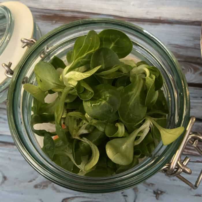 Wieder wird das Gemüse etwas nach unten geschoben, um Platz zu machen und dann bis oben hin mit FeldSalat aufgefüllt.