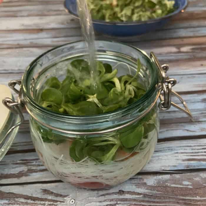Wenn das Glas mit dem kalten, frisch gewaschenen und nassen Salat gefüllt ist, könnte man es einfach zumachen und für ein bis zwei Tage in den Kühlschrank stellen, bis man Lust auf diese Suppe hat.