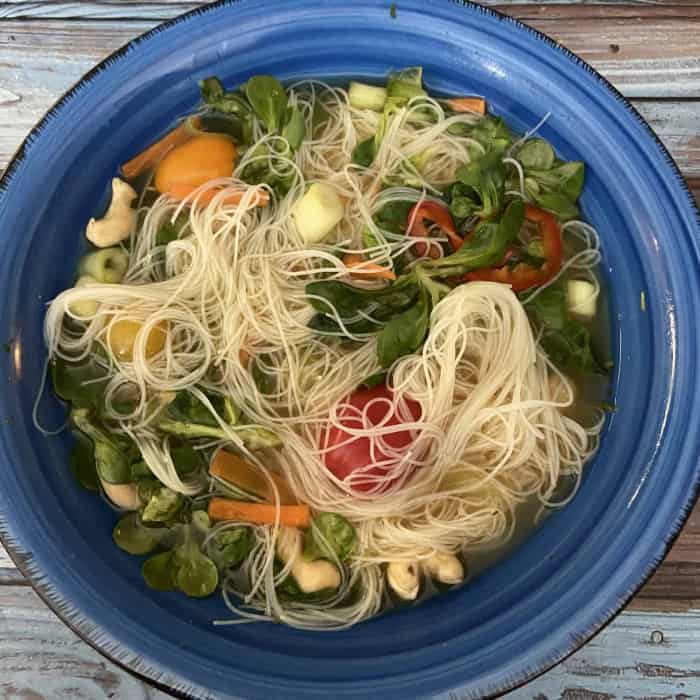 In diesem Fall habe ich fein geschnittene Frühlingszwiebelchen genommen, kleine Cherrytomaten in drei Farben. Auch sehr lecker sind hauchfein geschnittene Champignons, Erbsen, eingelegte KaiserSchoten und ein bisschen rote Paprika in hauchfeinen Scheiben, ein paar zu Stifen geschnittene Stückchen Möhre.
