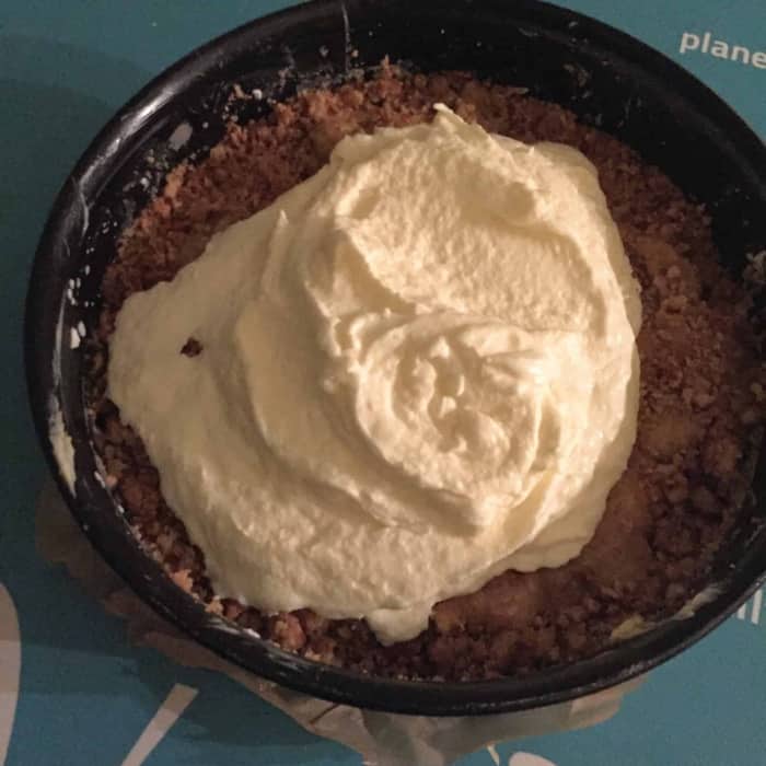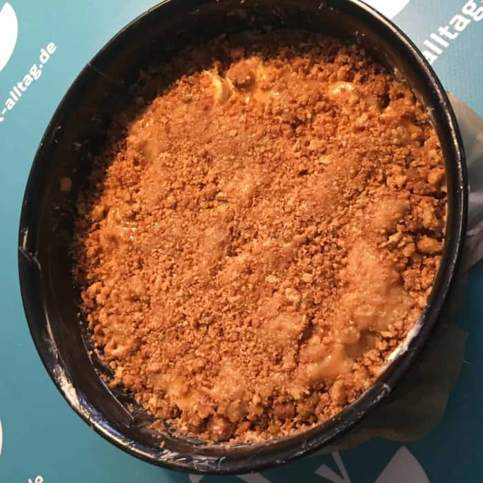 - Wenn die Kekskrümel auf “Kuchenhöhe” sind, die restlichen gebutterten Krümel auf den Pie geben.