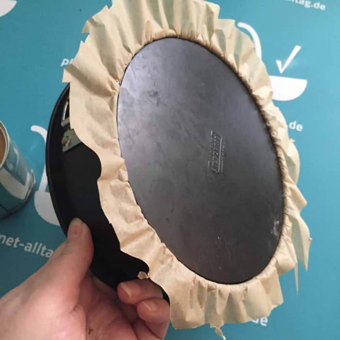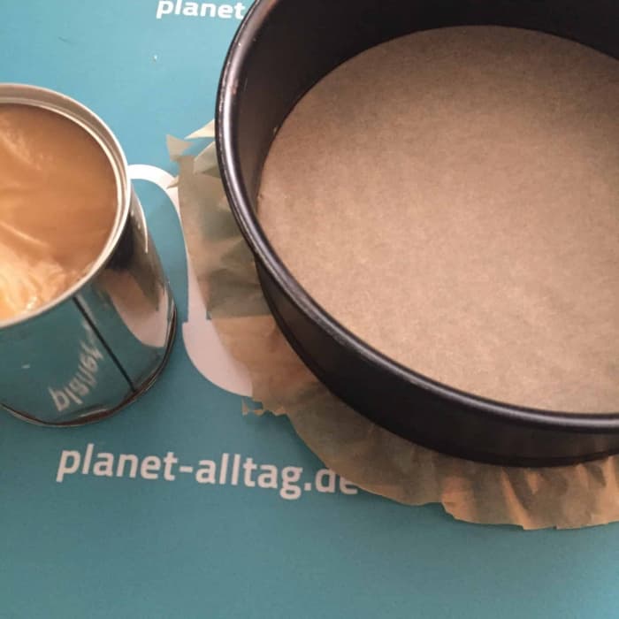 Dann eine kleine Kuchenform mit passend zugeschnittenem Backpapier auslegen und die Ränder gut einfetten.