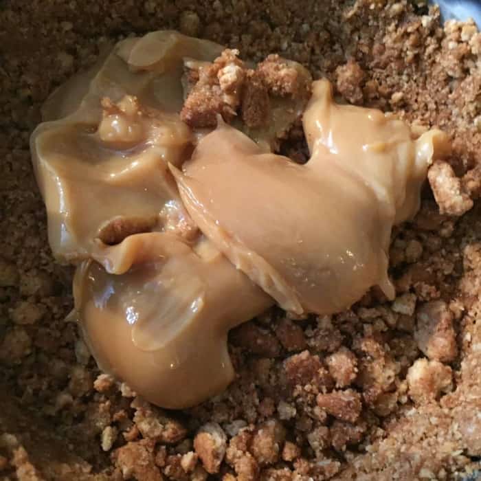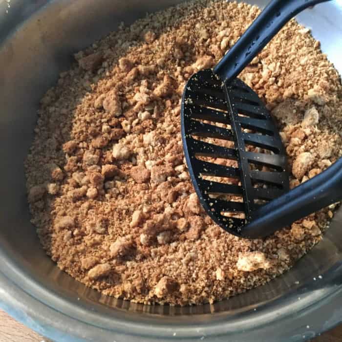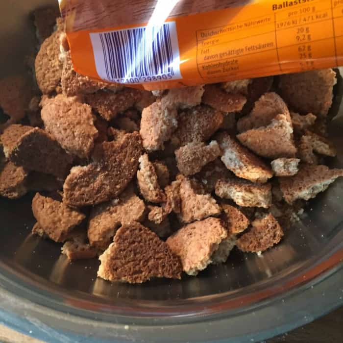 - Die Butter schmelzen und über die Kekskrümel giessen.