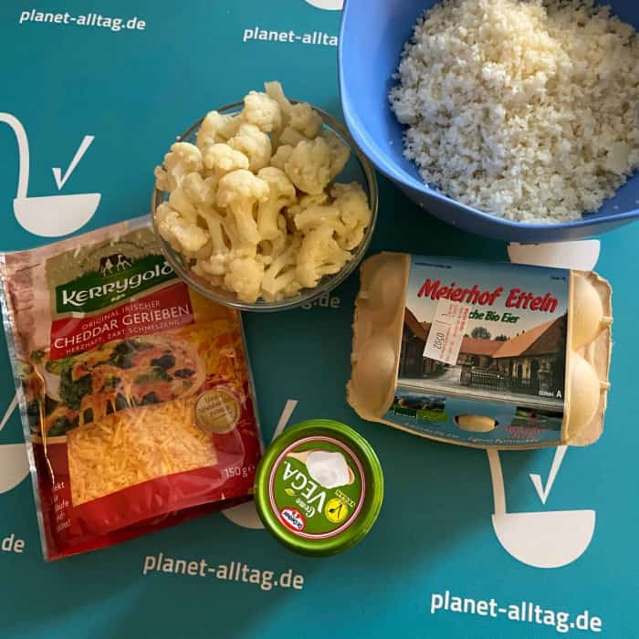 - Einige Blumenkohlröschen für die Deko beiseite legen, den Rest fein schreddern (“Blumenkohlreis”)
