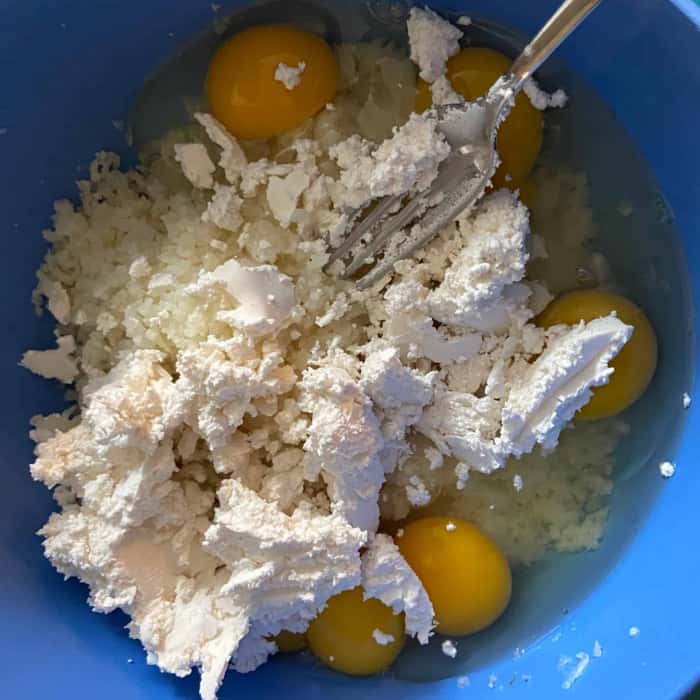 - Den geschredderten Blumenkohl unzeremoniell mit Saurer Sahne und den Eier verrühren. Würzen.