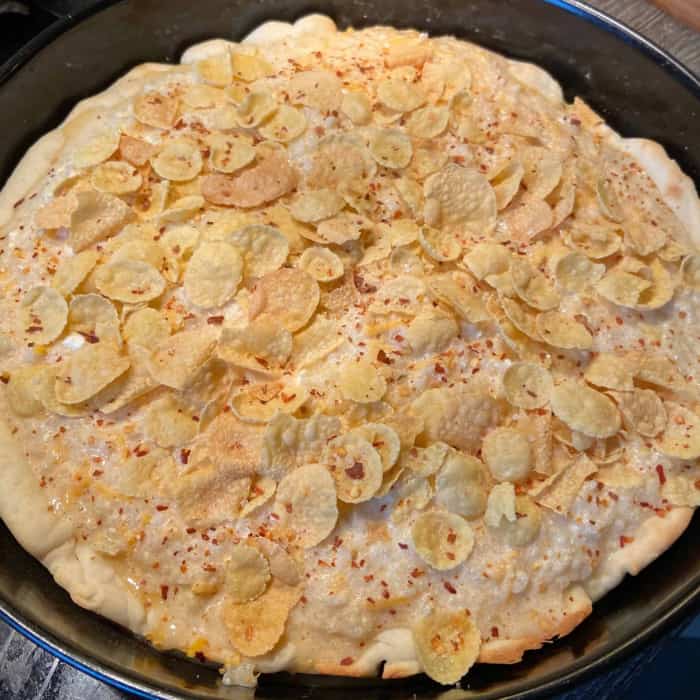 - Als »Füllung« auf den vorgebackenen Pizzaboden geben, mit Chili-Flocken aus der Mühle bestreuen, ggf. salzen