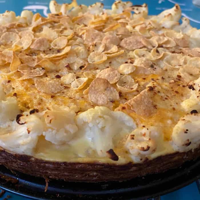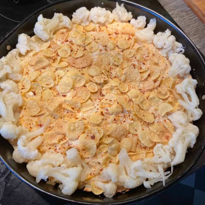 - Eine dünne flächendeckende Kruste aus Cornflakes auf der Blumenkohl-Ei-Masse verteilen