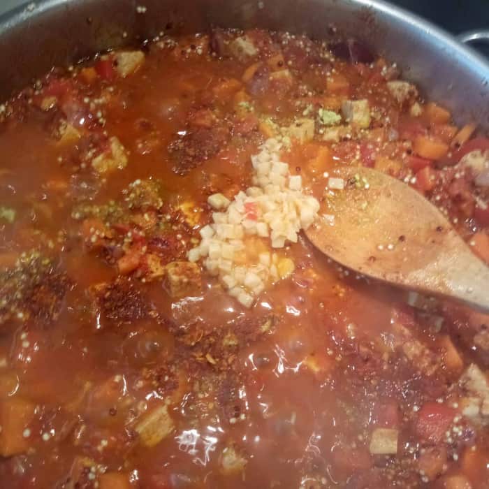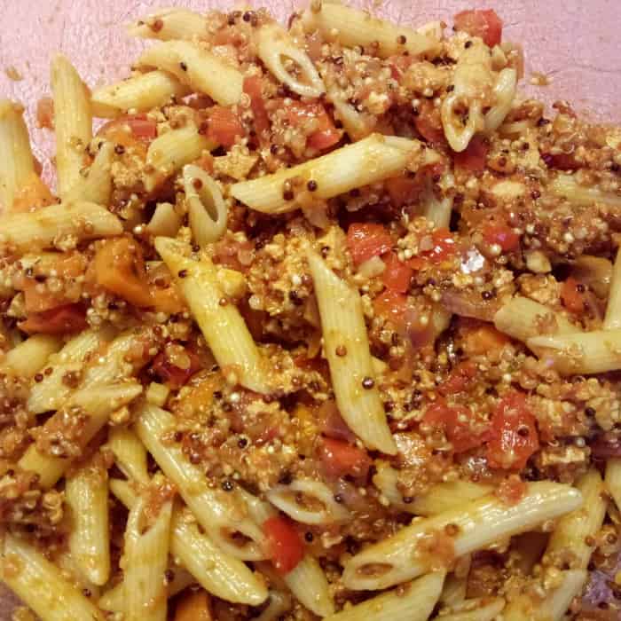 Für die Boloveganese haben wir bunte Quinoa gewählt und sie erst gewaschen, dann abtropfen lassen. Vorher gekocht werden muss es nicht, denn es kocht ja im Tomatensud der veganen Bolognese noch mit.