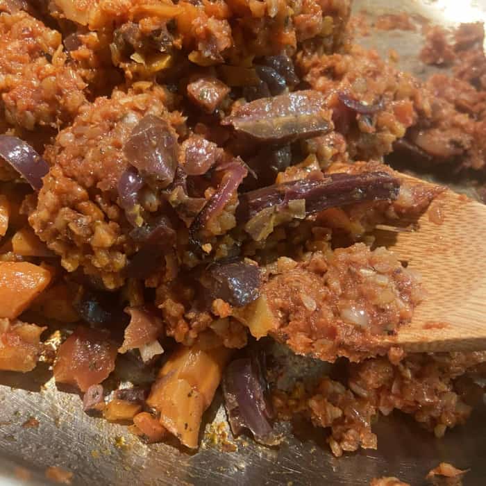 - Anschließend einen gehäuften Esslöffel Burger-Gewürz durchrühren und den Buchweizen noch 15 Minuten länger quellen lassen.
