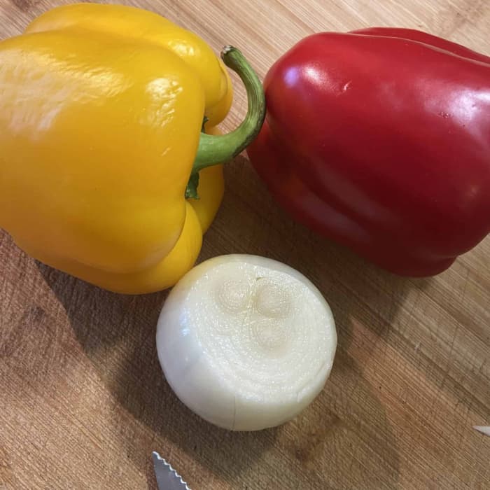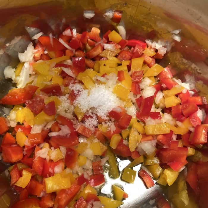 - Paprika und Zwiebeln werden in kleine Stpcke geschnitten und in Olivenöl angedünstet.