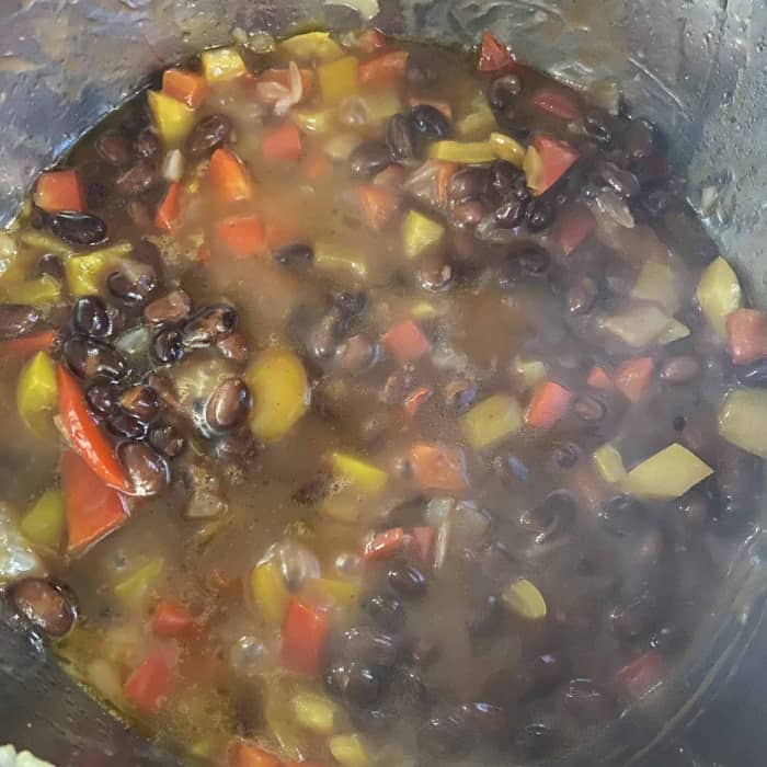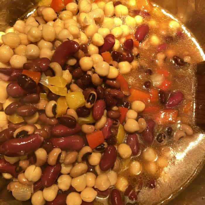 - Kurz stark erhitzen, dann die Temperatur auf mittel herunterschalten und die restlichen Bohnen, Mais und Kichererbsen hinzufügen.