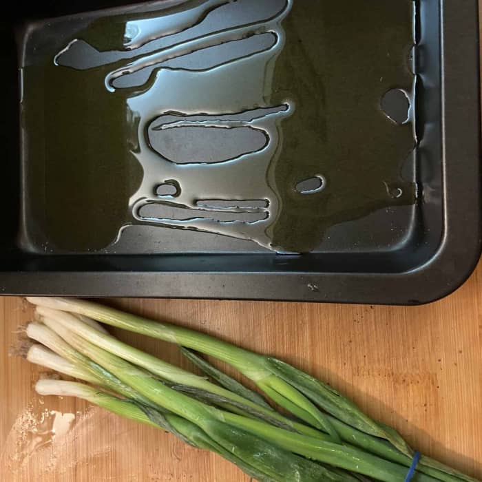 - Ofenblech einölen, mit den kleingeschnittenen Zwiebeln bestreuen