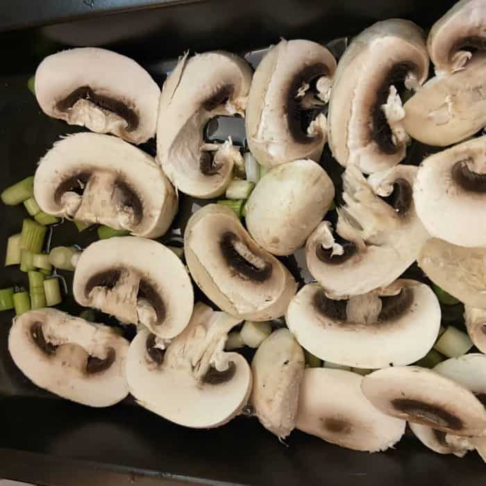 - Die in dicke Scheiben geschnittenen Pilze nebeneinander schichten.