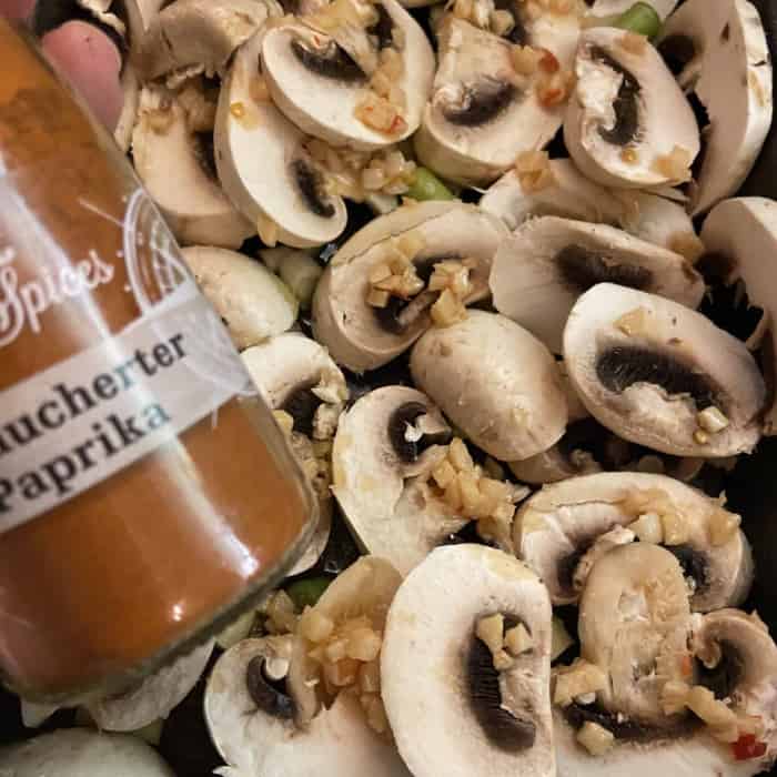 - Paprika, Salz, Pfeffer und Chili über die Pilze streuen, noch etwas Öl.