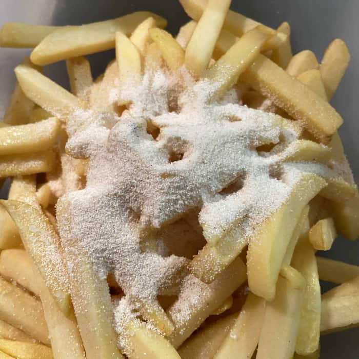 - Eine Plastikschüssel mit luftdichtem Deckel nehmen. Pommes, Öl, Salz und Polenta hineingeben.