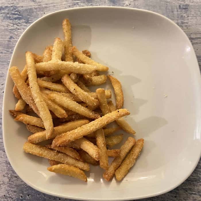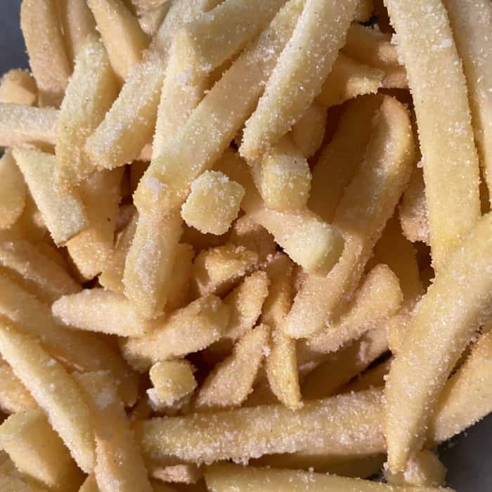 - Die Backofenpommes aus der Tüte holen und auf einem Holzbrett fünf Minuten ausbreiten zum Antauen.