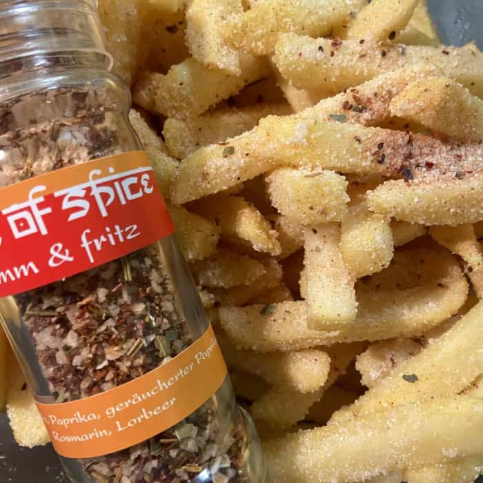 Wenn man die Pommes in Öl mit Salz mariniert und dann zwei Esslöffel Polenta hinzufügen für eine goldene Kruste, muss man sie nicht frittieren. Wir mögen keine Friteuse und wollen auch nichts mit Fett durchtränktes essen - aber wenn Ihr das mögt und macht, braucht Ihr wahrscheinlich keine Polenta, um es knuspern zu lassen 😊
