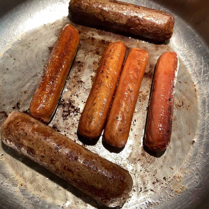- 10 Minuten bevor die Pommes fertig ist, die veganen Bratwürste in einer Bratpfanne in ausreichend Öl braten.