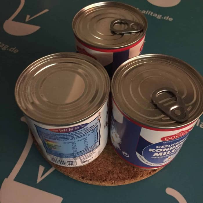 Wichtig ist auch: Die Dosen müssen beim Kochen immer zwei Finger hoch mit Wasser bedeckt sein. Wenn das Wasser verkocht und die Dose explodiert, kann das bei heißem Karamell sehr gefährlich werden. Also regelmäßig nachschauen, ob noch genug Flüssigkeit im Topf ist.