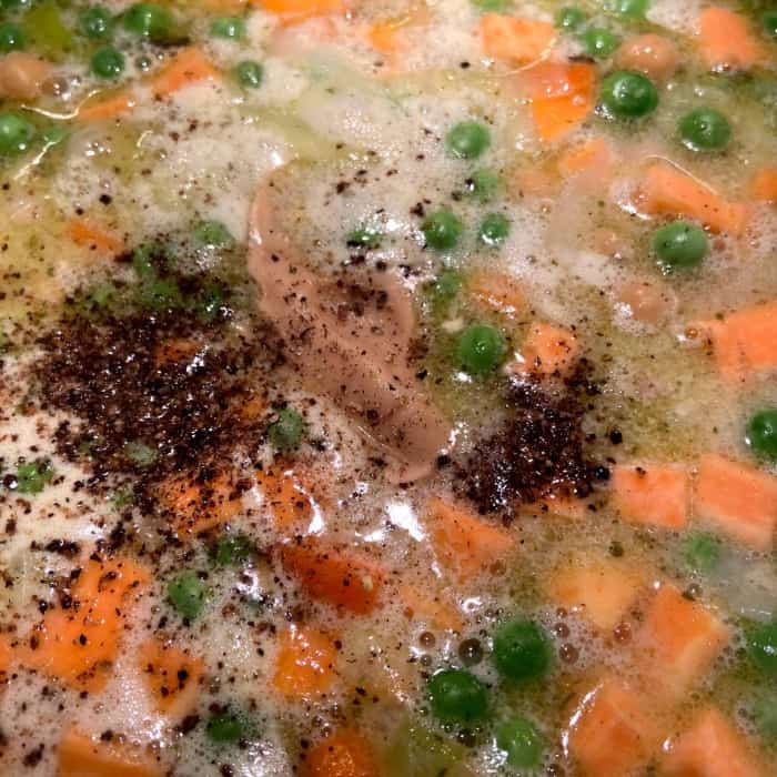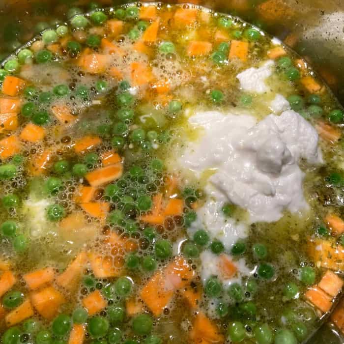 - Einen halben Liter Gemüsebrühe in den Topf geben, beide Sorten Erbsen ergänzen.