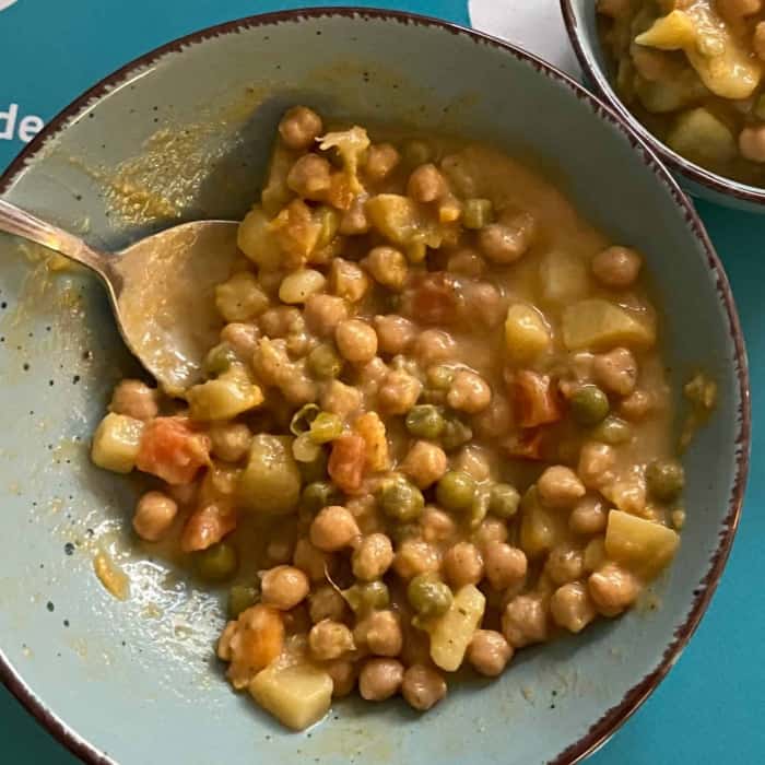 Das ist die Party-Portion, ein großer Topf voll. Die Kichererbsensuppe mit Erdnuss-Sosse verschwindet aber sowieso, egal wie viel gekocht wird. Falls doch mal was übrig bleiben sollte: Abtropfen und Wraps damit füllen, oder einfrieren.