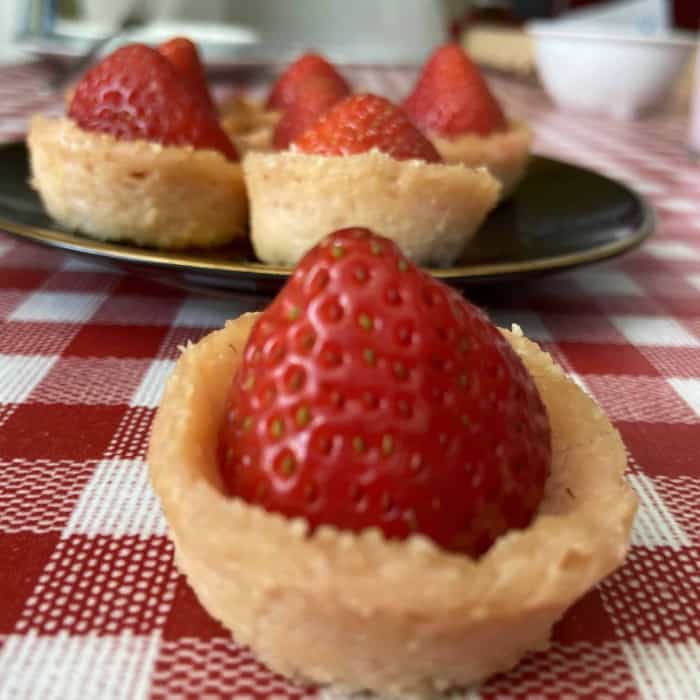 Das Ergebnis ist trotzdem hübsch, denn statt auf einen normal hohen klitzekleinen Käsekuchen ein “Kleeblatt” aus drei Erdbeerscheibchen zu legen, habe ich dann einfach ganze Erdbeeren hineingesetzt.