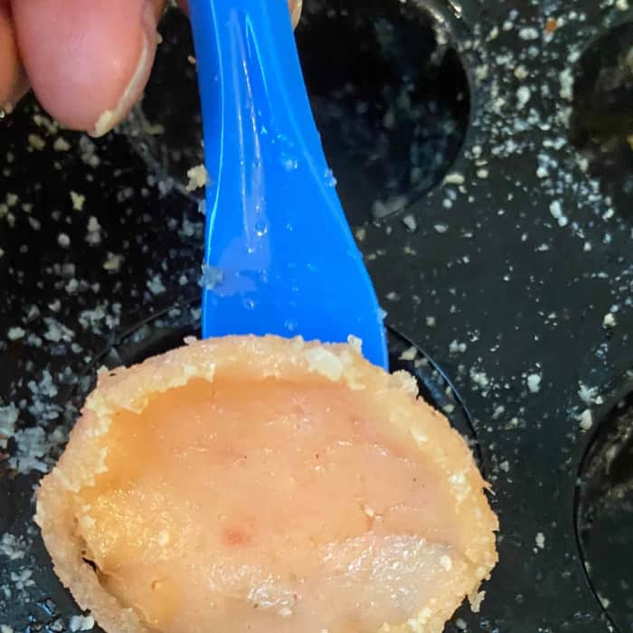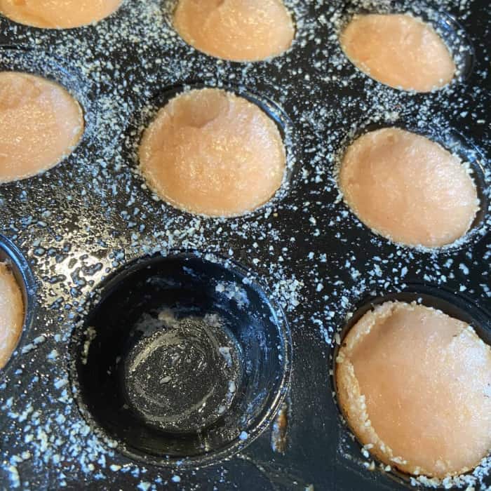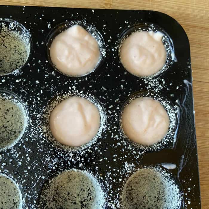- Eine Minimuffinform gründlich ausfetten und mit gemahlenen Mandeln ausstreuen.