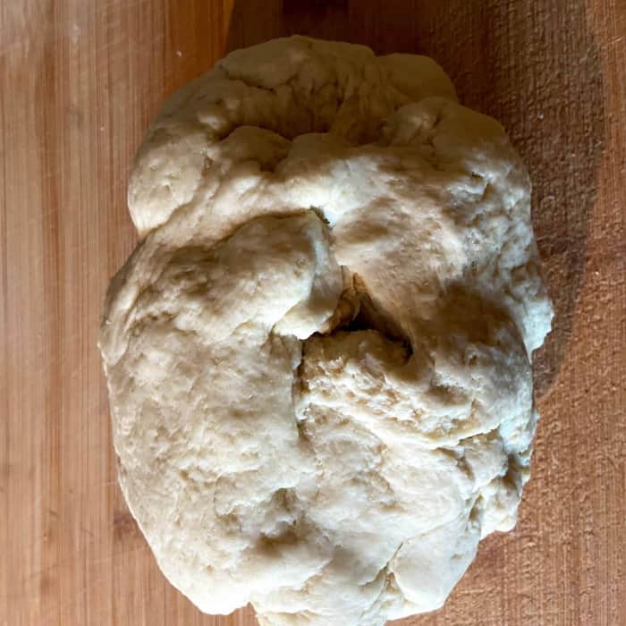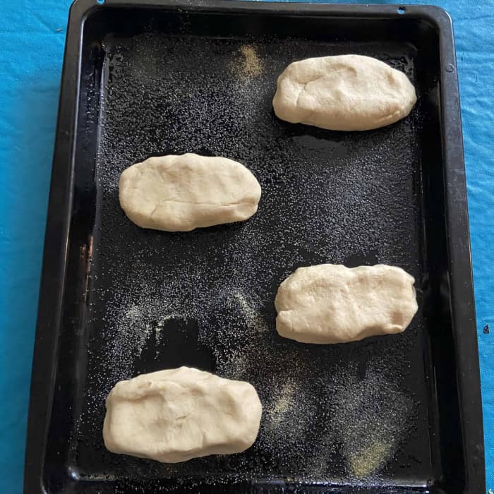 - Drei bis vier runde Fladen oder längliche Brote formen.