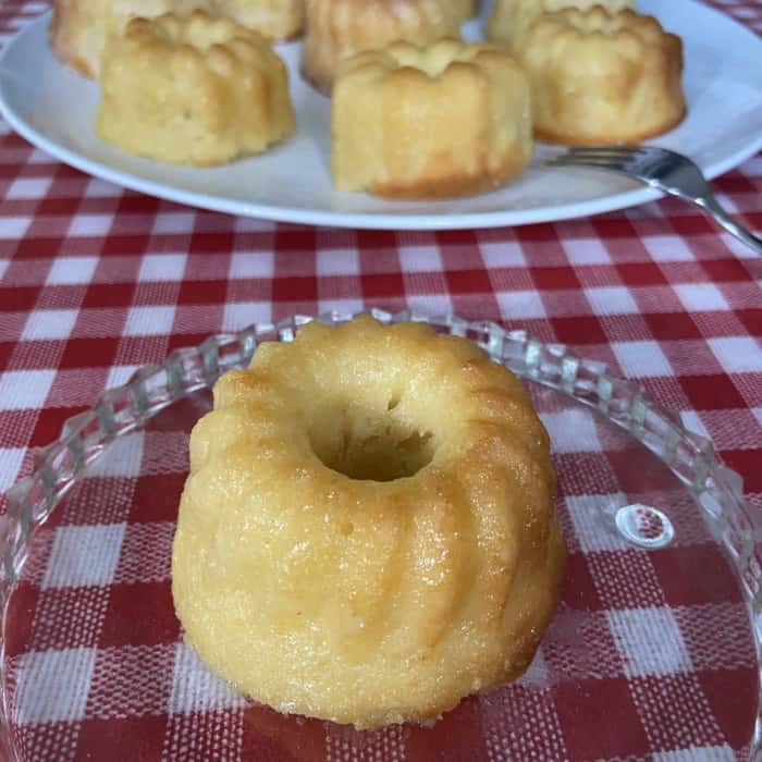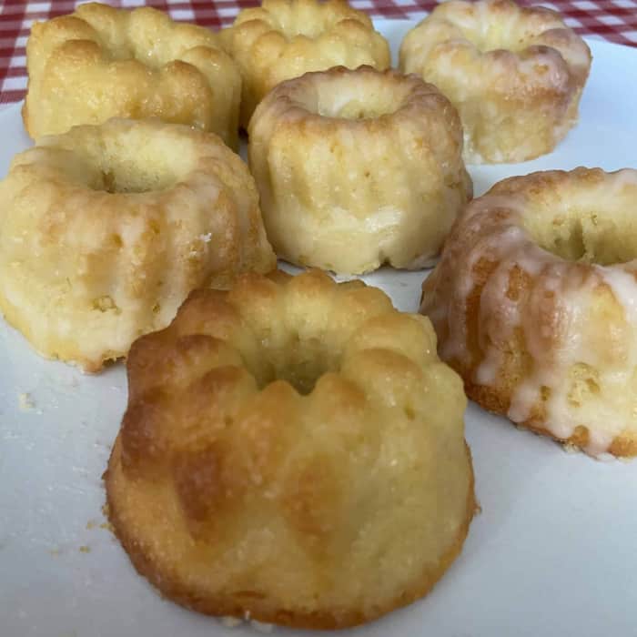 Wir haben unsere mehlfreien veganen Grieß-Gugelhupfe mit einer superdicken Schicht aus selbst gerührtem Zitronenguss verziert, deswegen glänzen sie auf den meisten Fotos so.