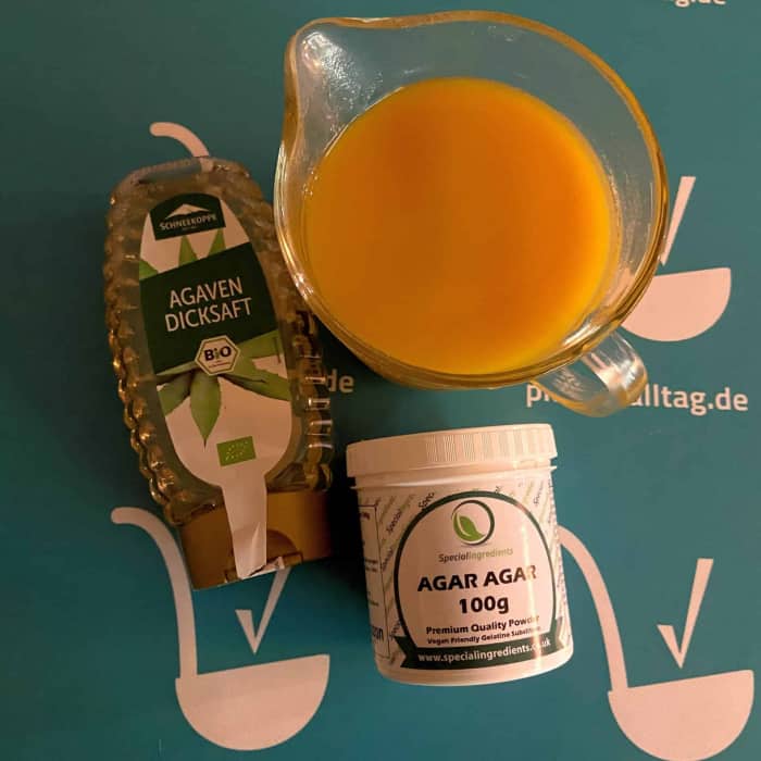 - 500 ml Obstsaft (z.b Orange) und 50 g Agavendicksaft sorgfältig vermengen