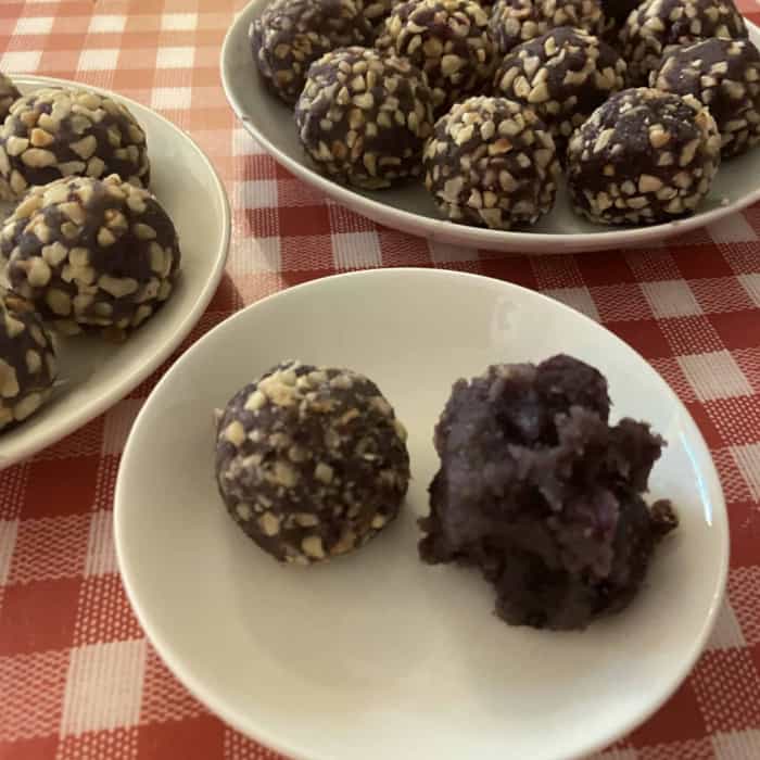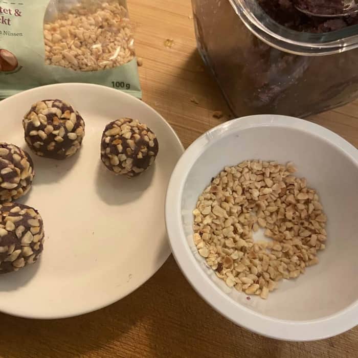 - Über Nacht kaltstellen. Am nächsten Tag Kugeln formen und in den gehackten Mandeln wälzen.