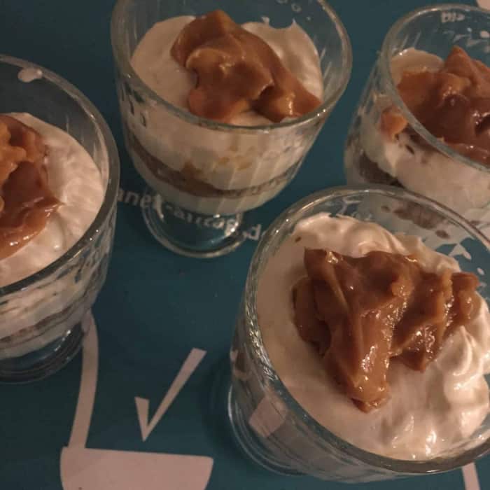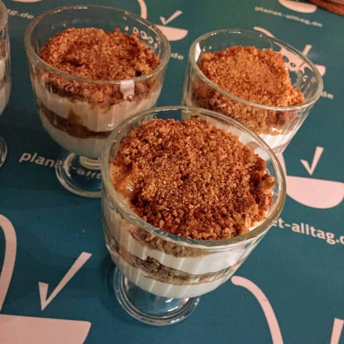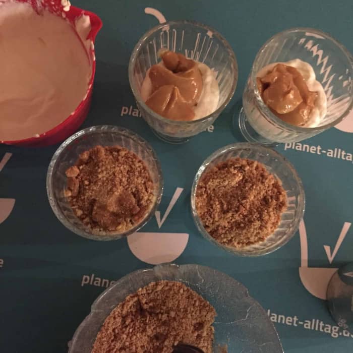 Wir haben Hobbits Haferkekse von Bahlsen genommen. Das Rezept ergibt einen Liter Dessert bzw. vier Portionen à 250 Milliliter und lässt sich in weniger als zehn Minuten zusammenrühren, wenn die Karamellcreme bereits fertig ist.