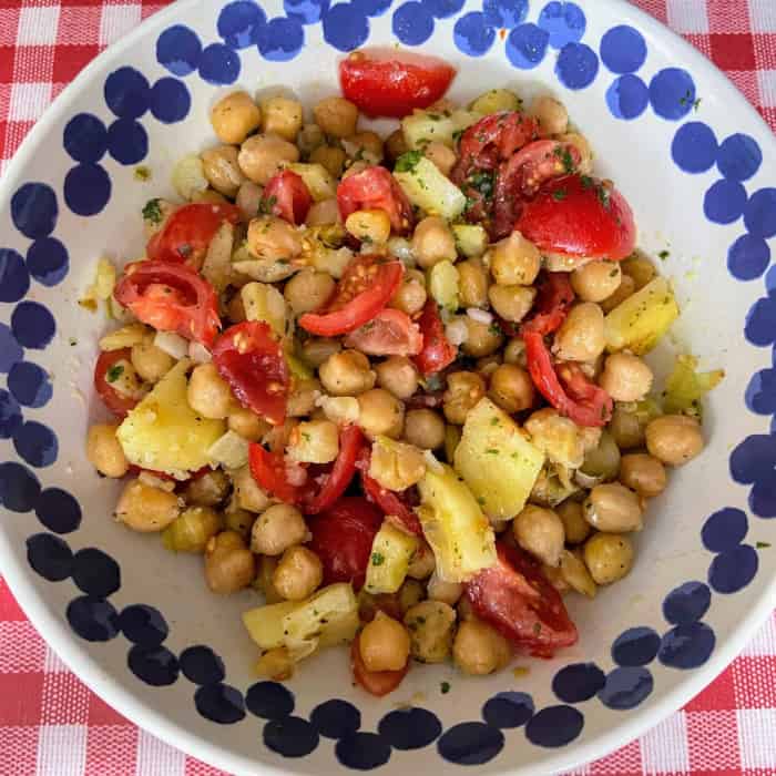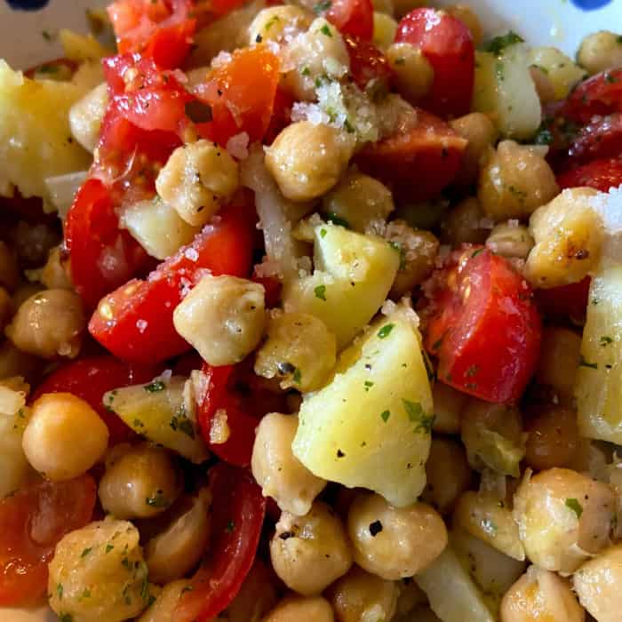 Statt mit Kartoffelresten funktioniert der Kichererbsensalat auch mit Reis oder vielen Kohlsorten.