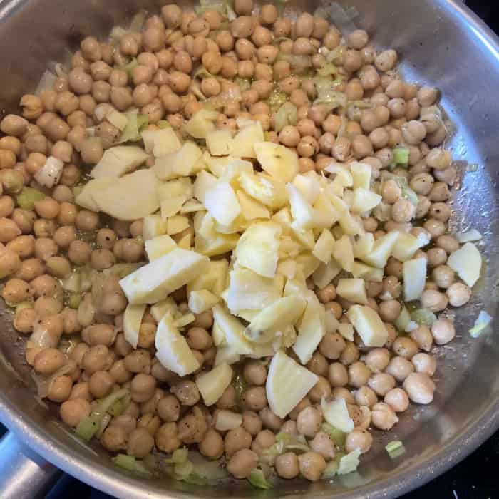 Die Kichererbsen entsprechen 2 Dosen à 400 Gramm. Statt Lauch gerne auch zwei kleine Zwiebeln, statt Kartoffeln geht auch gekochter Reis.