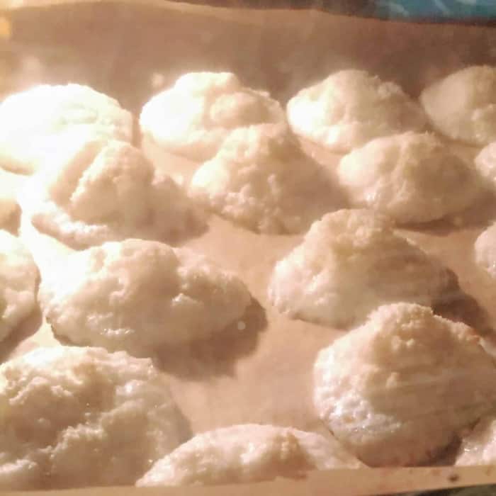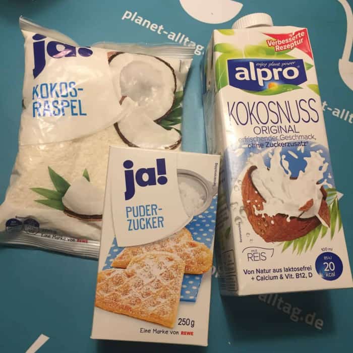 Beim zweiten Mal habe ich die Kokosmasse erst kalt gestellt, kein Backpulver verwendet wie beim ersten Anlauf und die Makronen auf niedriger Temperatur gebacken, nämlich 20 bis 25 Minuten bei 160 Grad (statt vorher 180) und sie sind perfekt.
