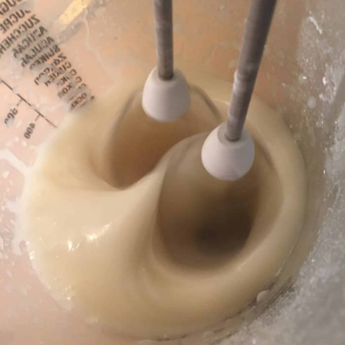- 75 ml Pflanzenmilch in ein hohes Gefäß geben und den Puderzucker damit verrühren.
