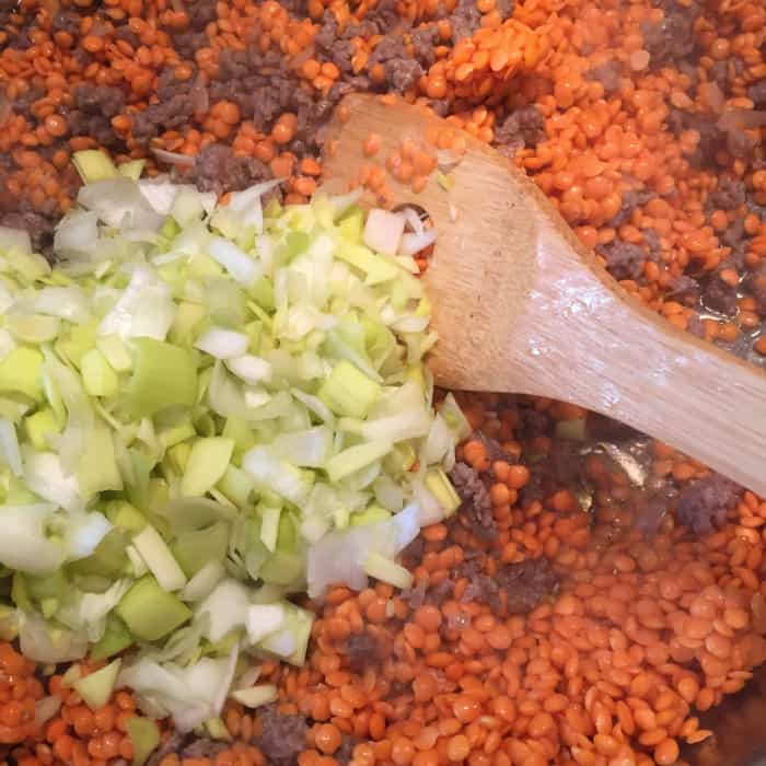 - Die abgetropften Linsen und den geschredderten Lauch mit in die Pfanne geben.