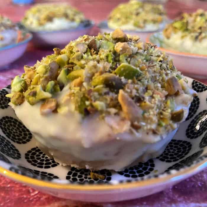 - Schokolade oder Kuvertüre auf dem Muffin verstreichen und ihn sofort in die Pistazien tunken.
