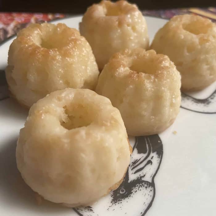 Die Backform muss unbedingt eingesprüht oder eingefettet werden, sonst kann man nämlich nur noch Krümel bergen, so locker sind diese Gugelhupfe. Durch die offenen Poren der Gugelhupfe läuft die Glasur dann in die Küchlein: Köstlich! Besonders, wenn sie ein paar Stunden durchziehen.