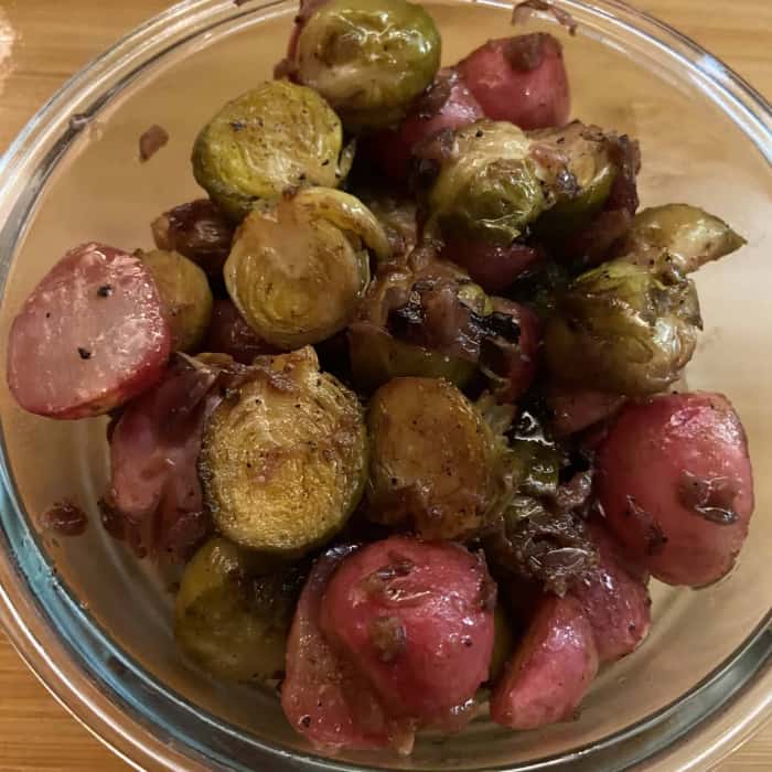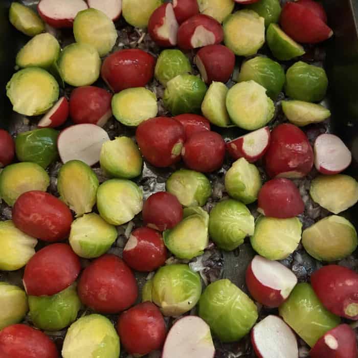 - Die Zwiebeln auf dem Backblech verteilen, den Rosenkohl und die Radieschen auch.