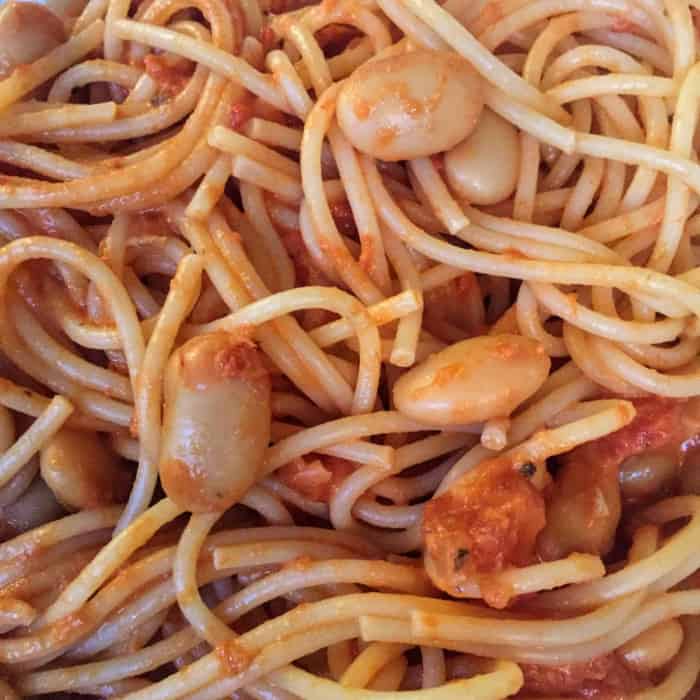 Wenn der eine keinen Käse mag und die andere keine Tomaten und man selbst gerade keinen Magen für Spinat hat, aber ein sehr schnelles und satt machendes Essen her soll, das auch für zwei Mahlzeiten reicht, dann sind große weiße Bohnen in Tomatensoße auf Pasta erstaunlich lecker.