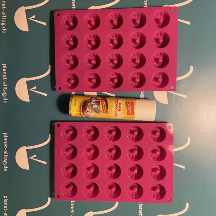 Verwendet habe ich zweimal diese BESTOMZ 20er Mini Gugelhupf Backform 30x20x2,3cm in rosa, die jeweils ca. 350 ml fasst und 20 Küchlein herstellt.