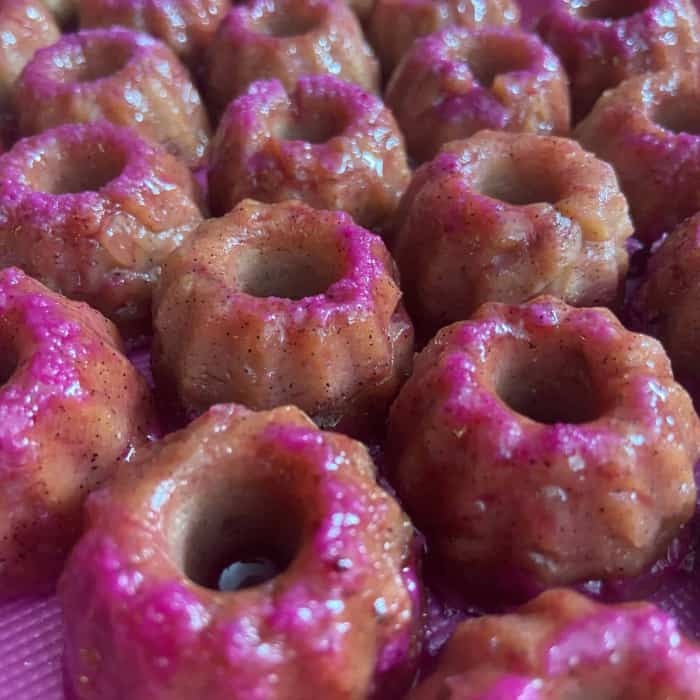 Ein Gugelhupf, der einen Haps groß ist: Pinker mini Käsekuchen. Der Puderzucker wird mit getrockneter Drachenfrucht gefärbt. Da die Gugelhupfe feucht sind, werden sie pink, sobald man sie damit bestreut.