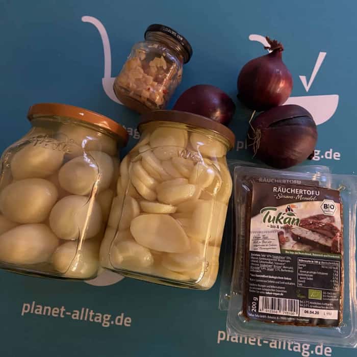 - Zwiebeln und den Knoblauch glasig schmurgeln, den Räuchertofu kurz anbraten
