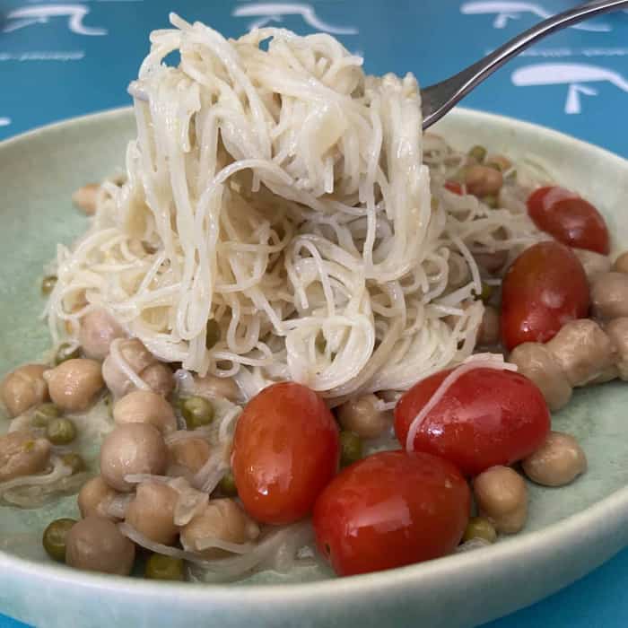 Reisnudeln hören sich nicht so an, als ob sie gut zu Kichererbsen passen, aber der Mix war sehr lecker und vor allem wirklich schnell gemacht. Dosenchampignons oder in diesem Fall Champignons aus dem Glas sind eigentlich gar nicht so mein Fall, ich habe sie aus einer Laune heraus mitgenommen und es passte vom geschmacklichen Gesamtkonzept her alles ganz gut.