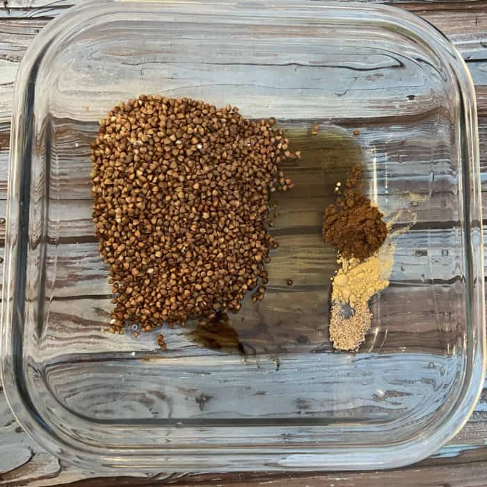 - Das weiche Öl mit den Flocken/der Grütze, dem Sirup und den Gewürzen direkt in der Form vermischen.