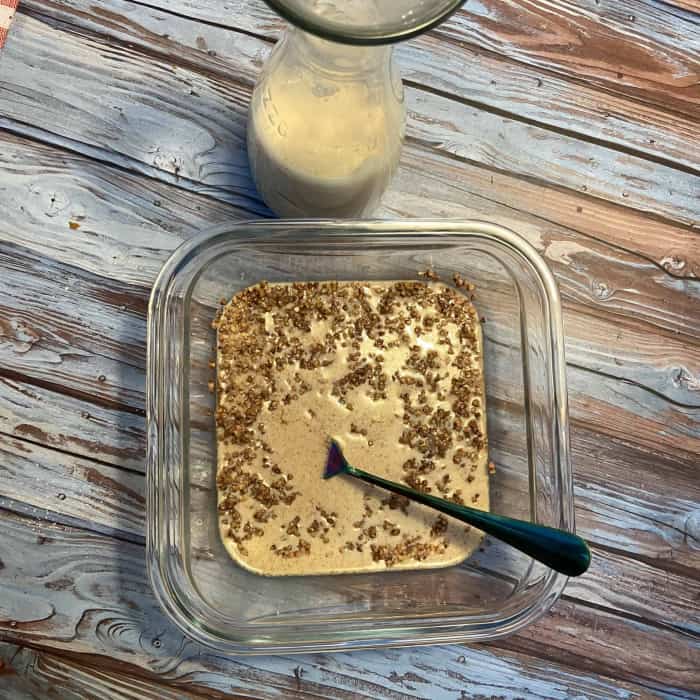 - Die Pflanzenmilch ebenfalls unterrühren und alles gut miteinander vermischen, gleichmäßig verteilen.