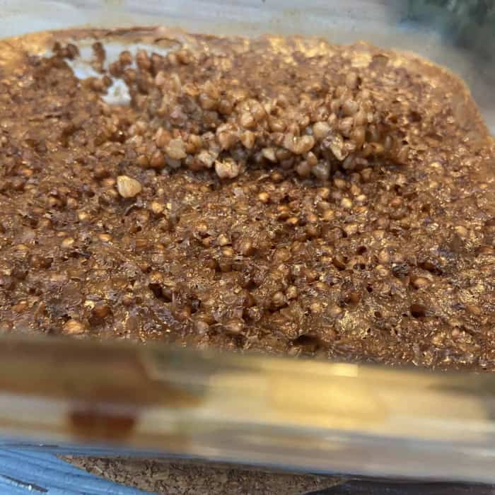 - Der Getreidebrei zum Frühstück wird 35 bis 45 Minuten gebacken: Bis die Flüssigkeit größtenteils aufgesogen ist.